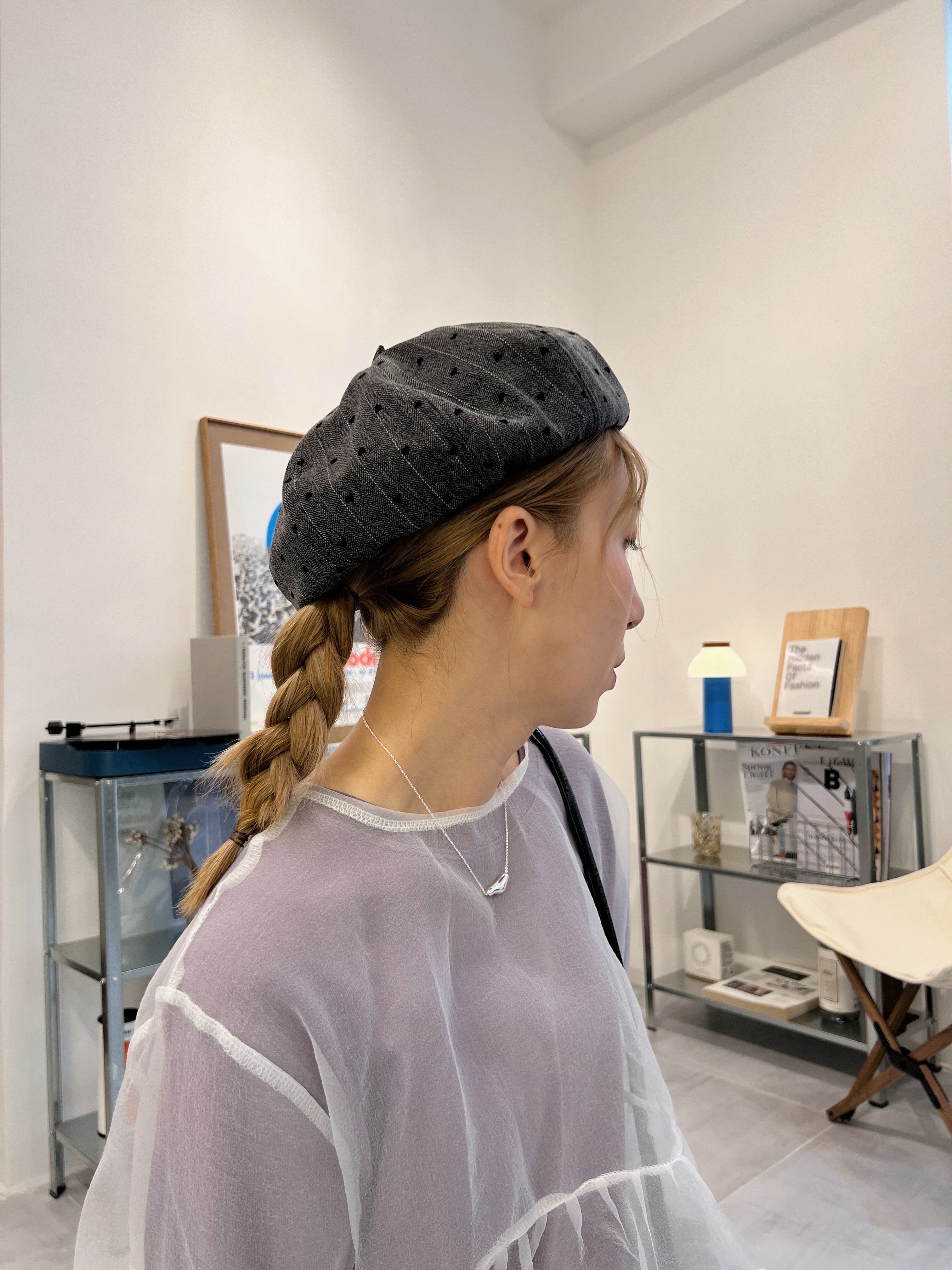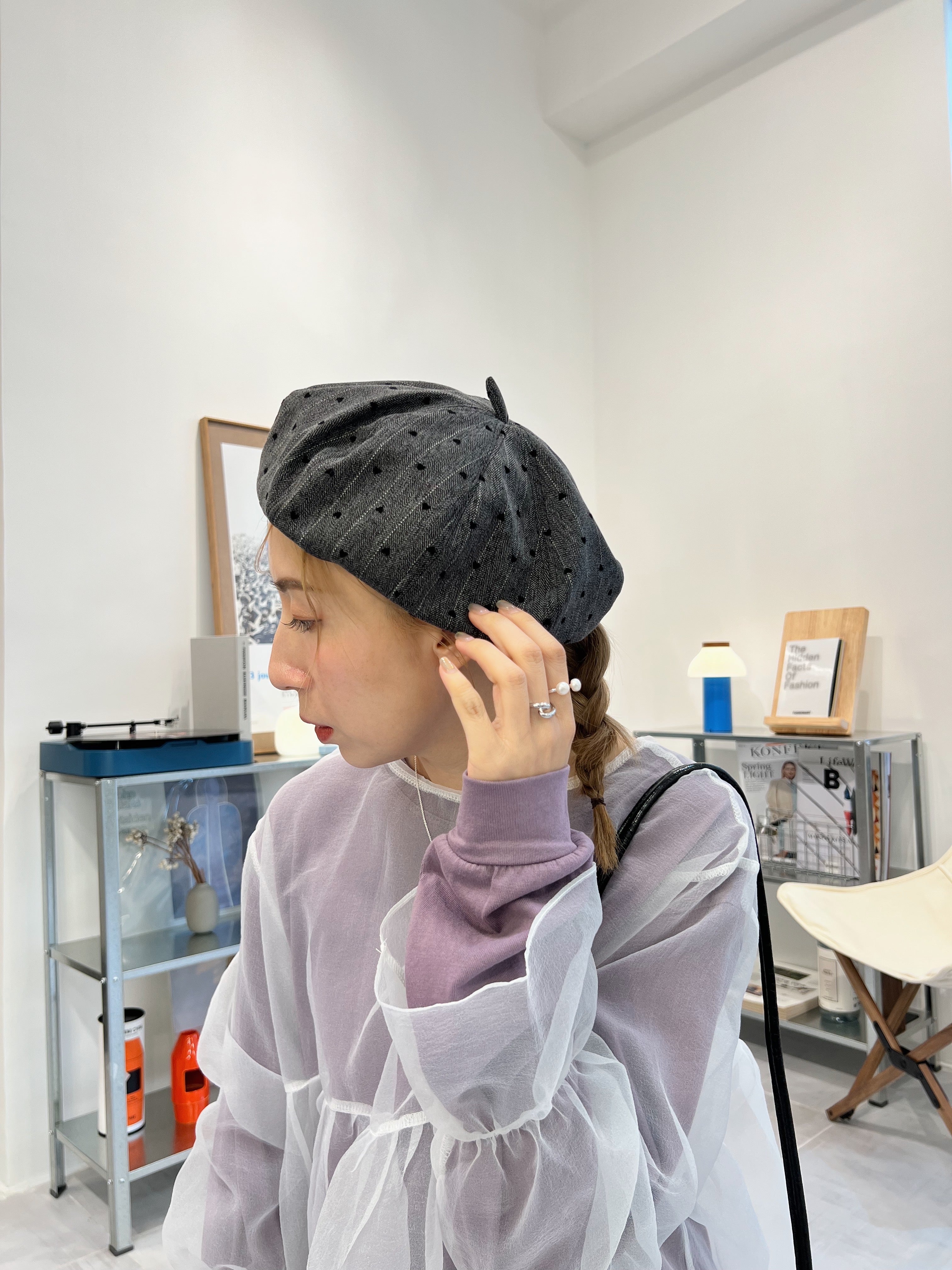 心心條紋具蕾帽/灰