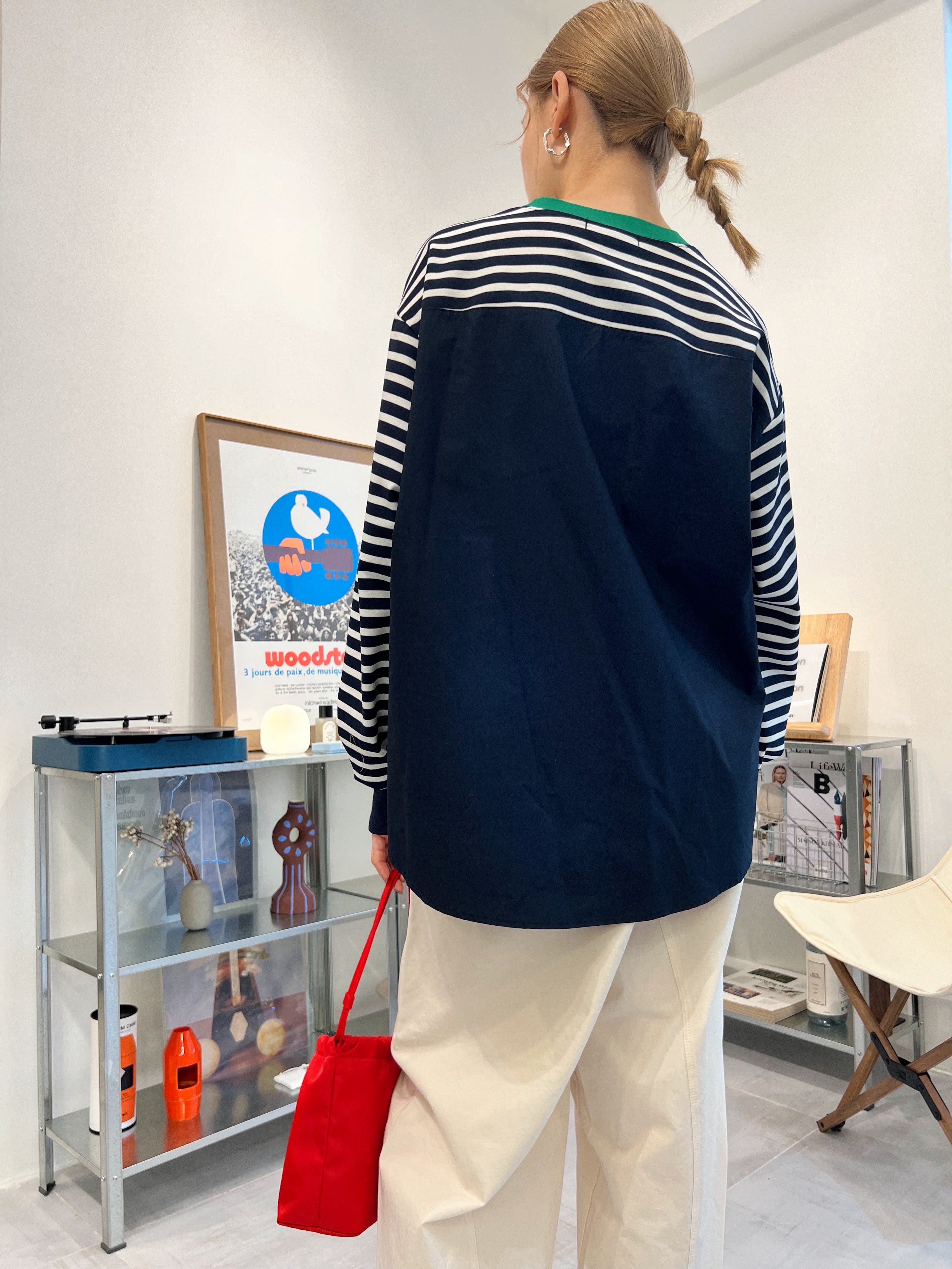 前間條後淨色T-shirt/綠領