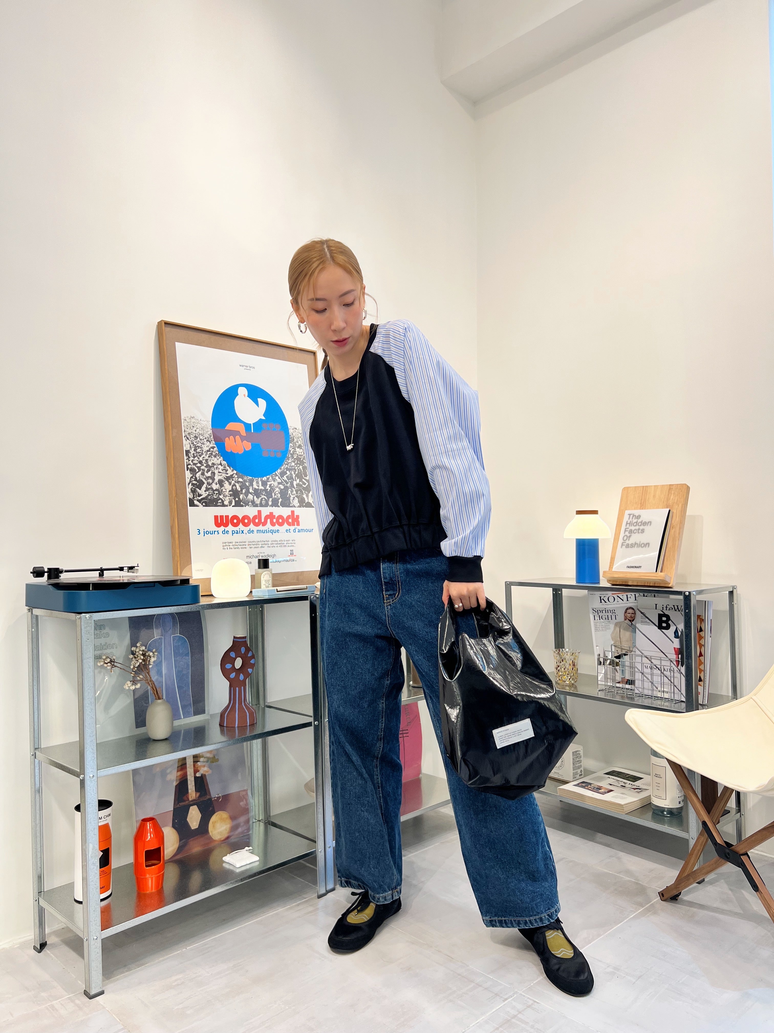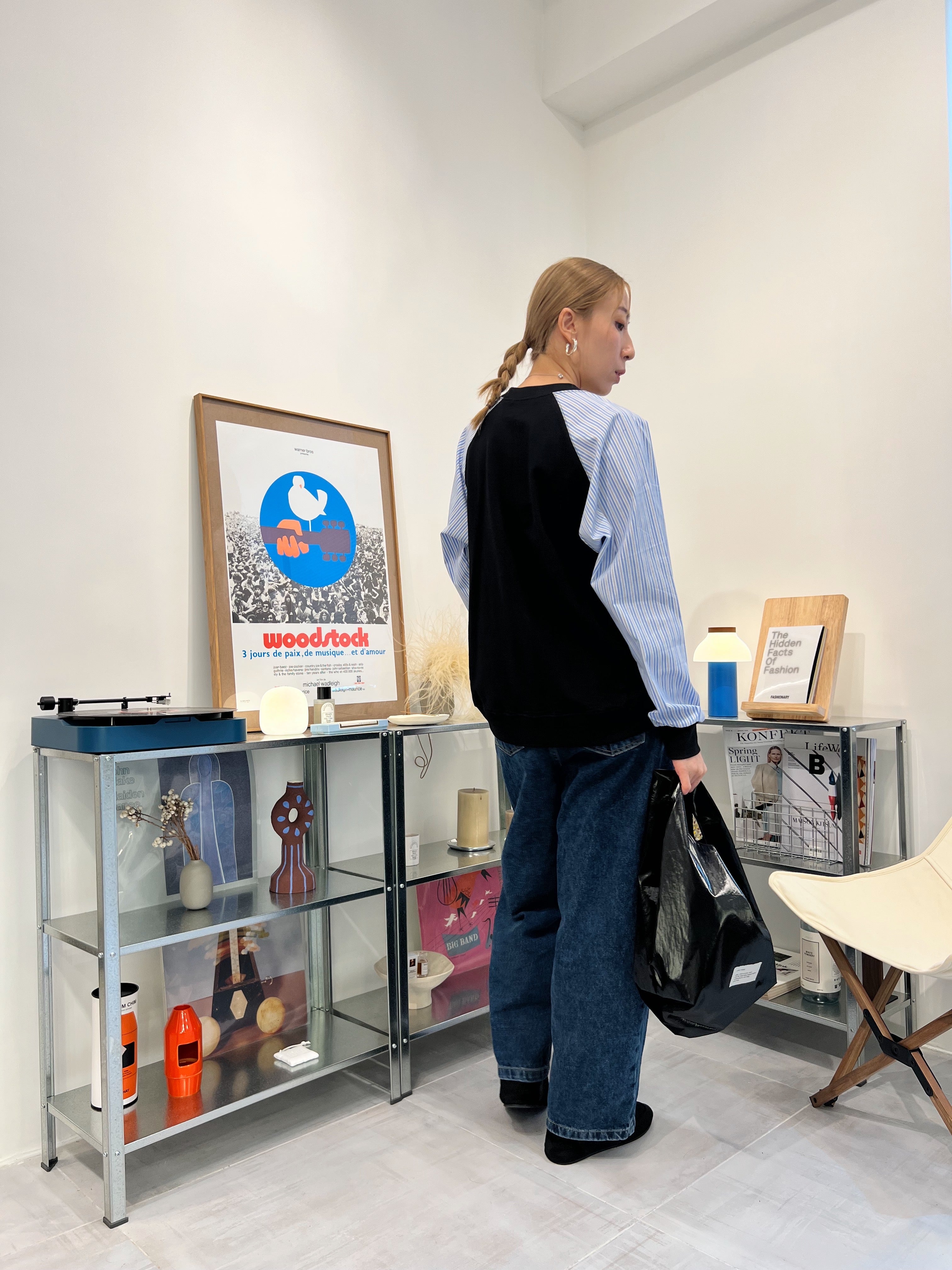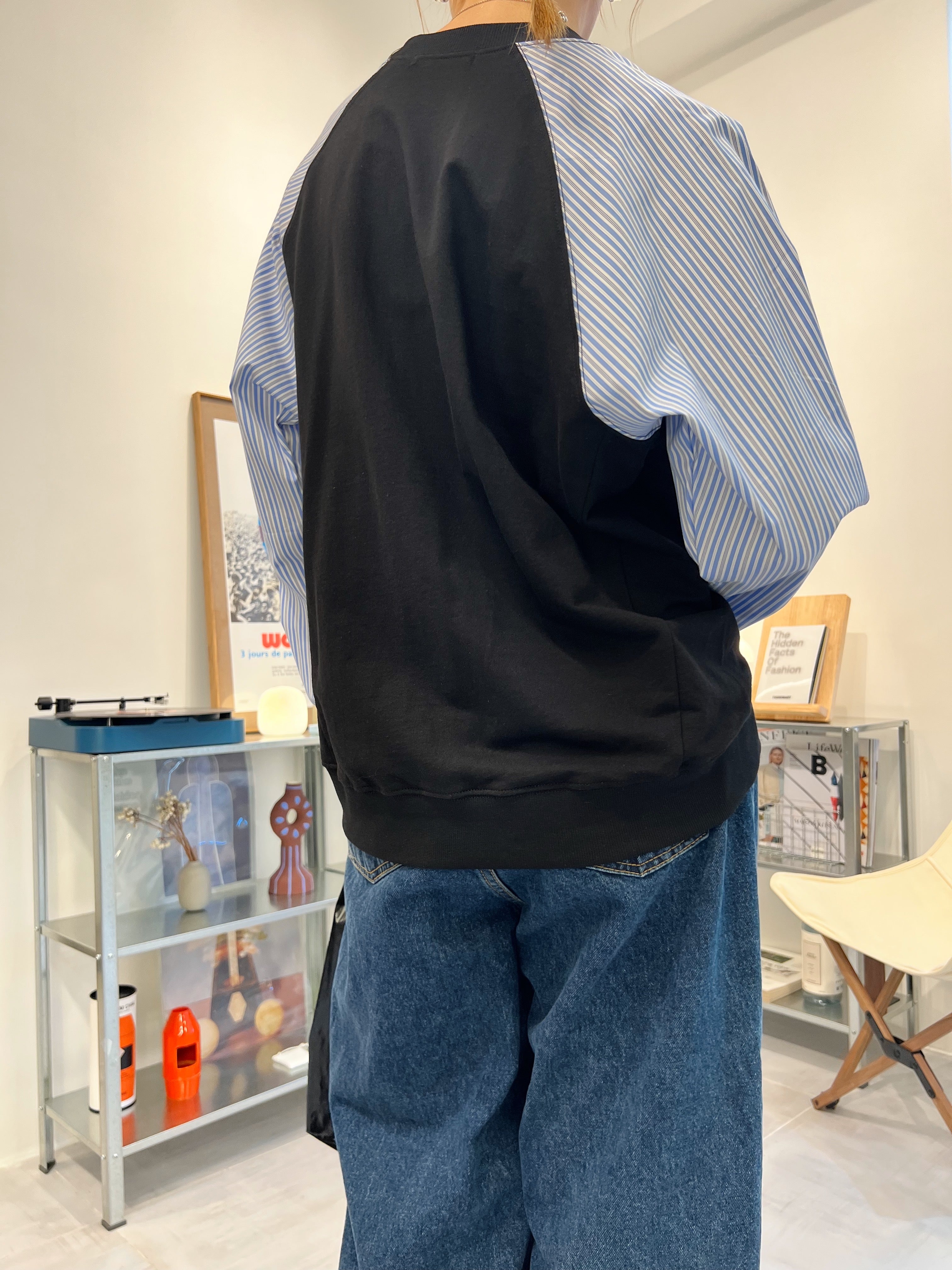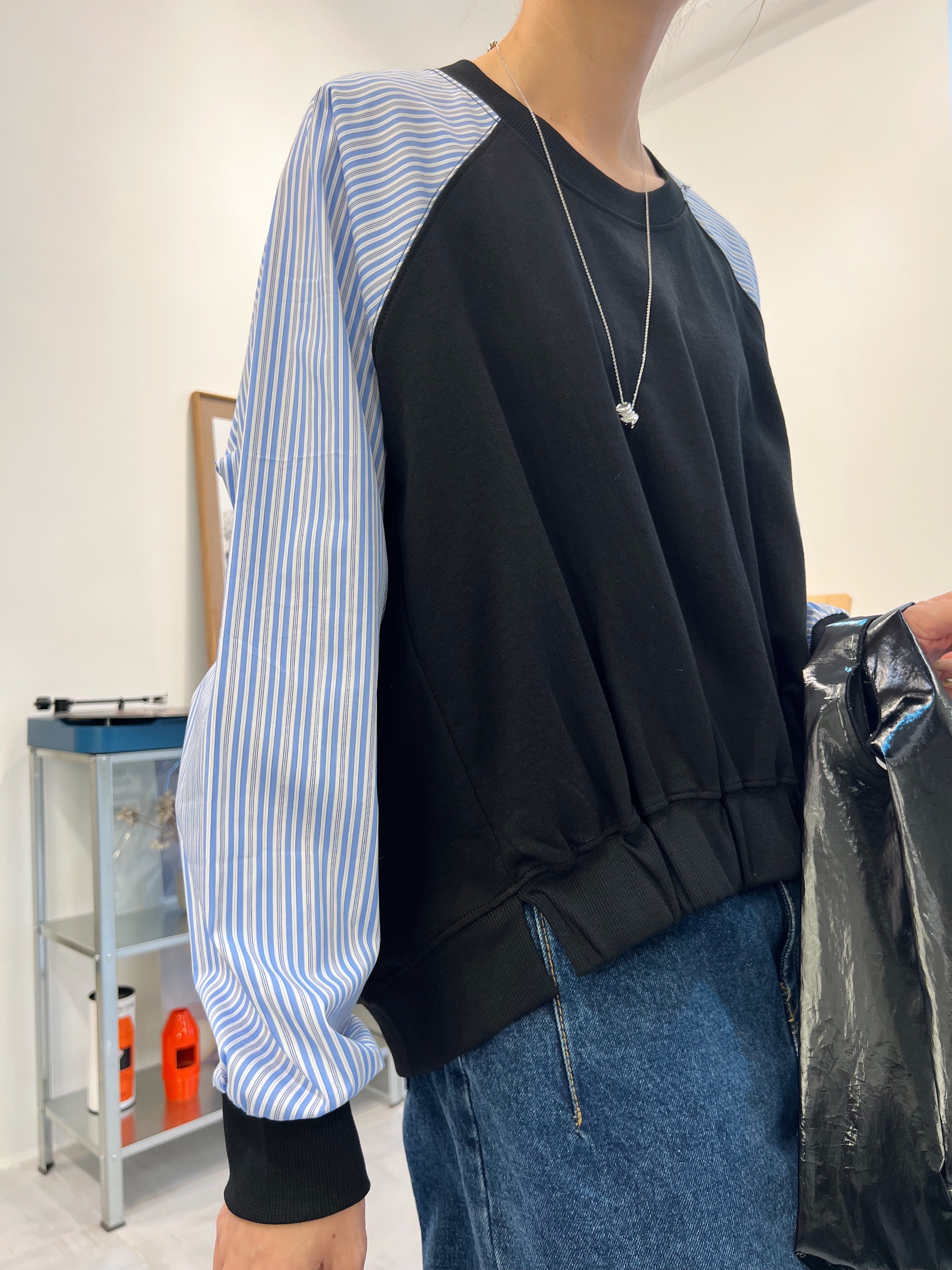 條子袖併布T-shirt/深藍